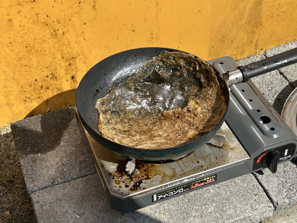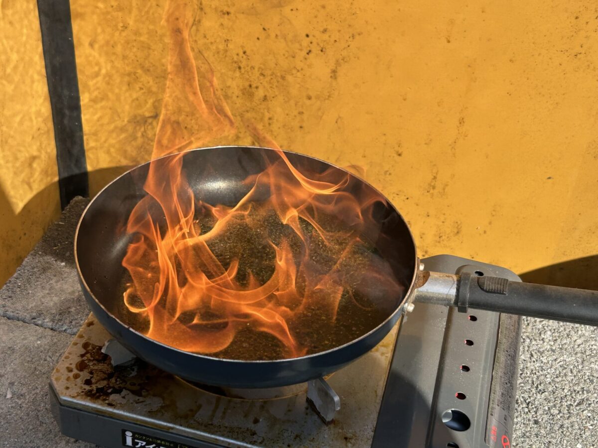 その後、天ぷら鍋火災の消火訓練へと移行しました。実際に火を使う訓練で危険が伴うため、近くに粉末消火器を用意しつつ