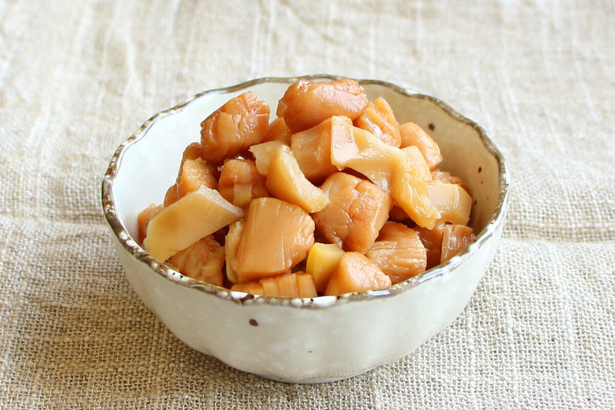 穂先たけのこにイタヤガイの貝柱を合わせて炊き上げ、うまみを染み込ませました。