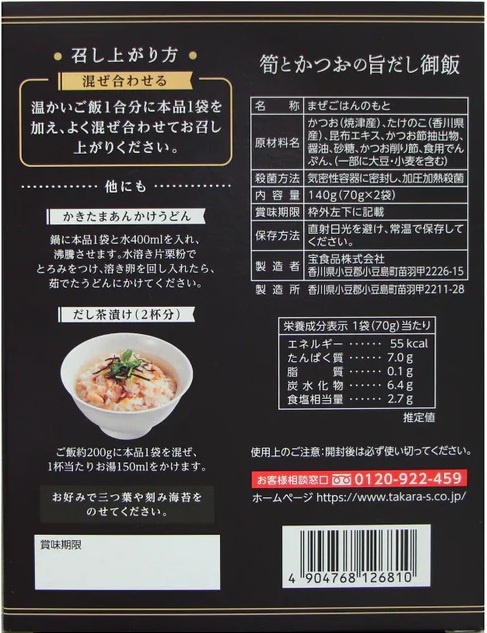 | 原材料 | かつお(焼津産)、たけのこ(香川県産)、昆布エキス、かつお節抽出物、醤油、砂糖、かつお削り節、食用でんぷん、(一部に大豆・小麦を含む) |